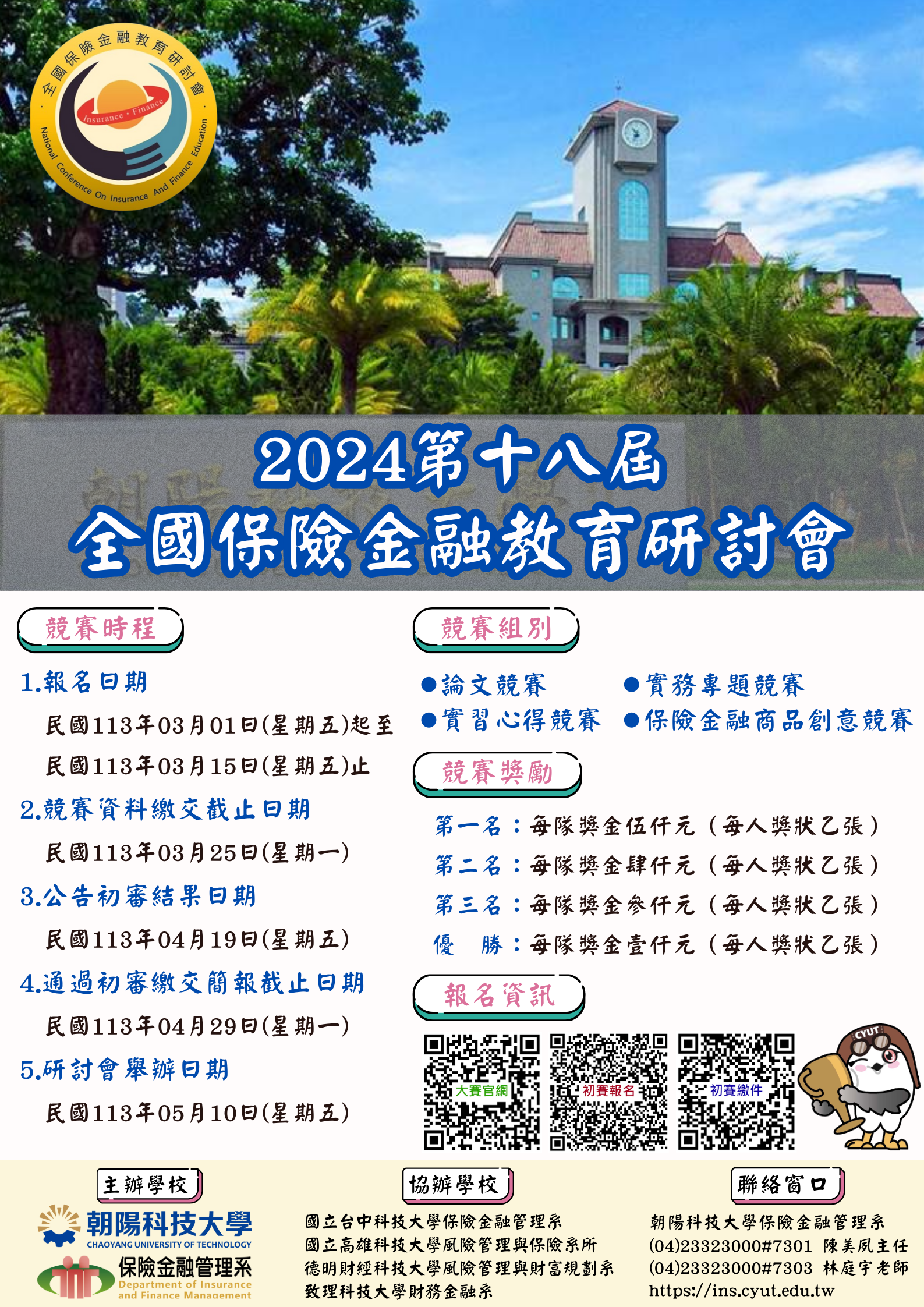 「2024第十八屆全國保險金融教育研討會」於5/10(五)於朝陽科大舉辦,歡迎各位踴躍共襄盛舉