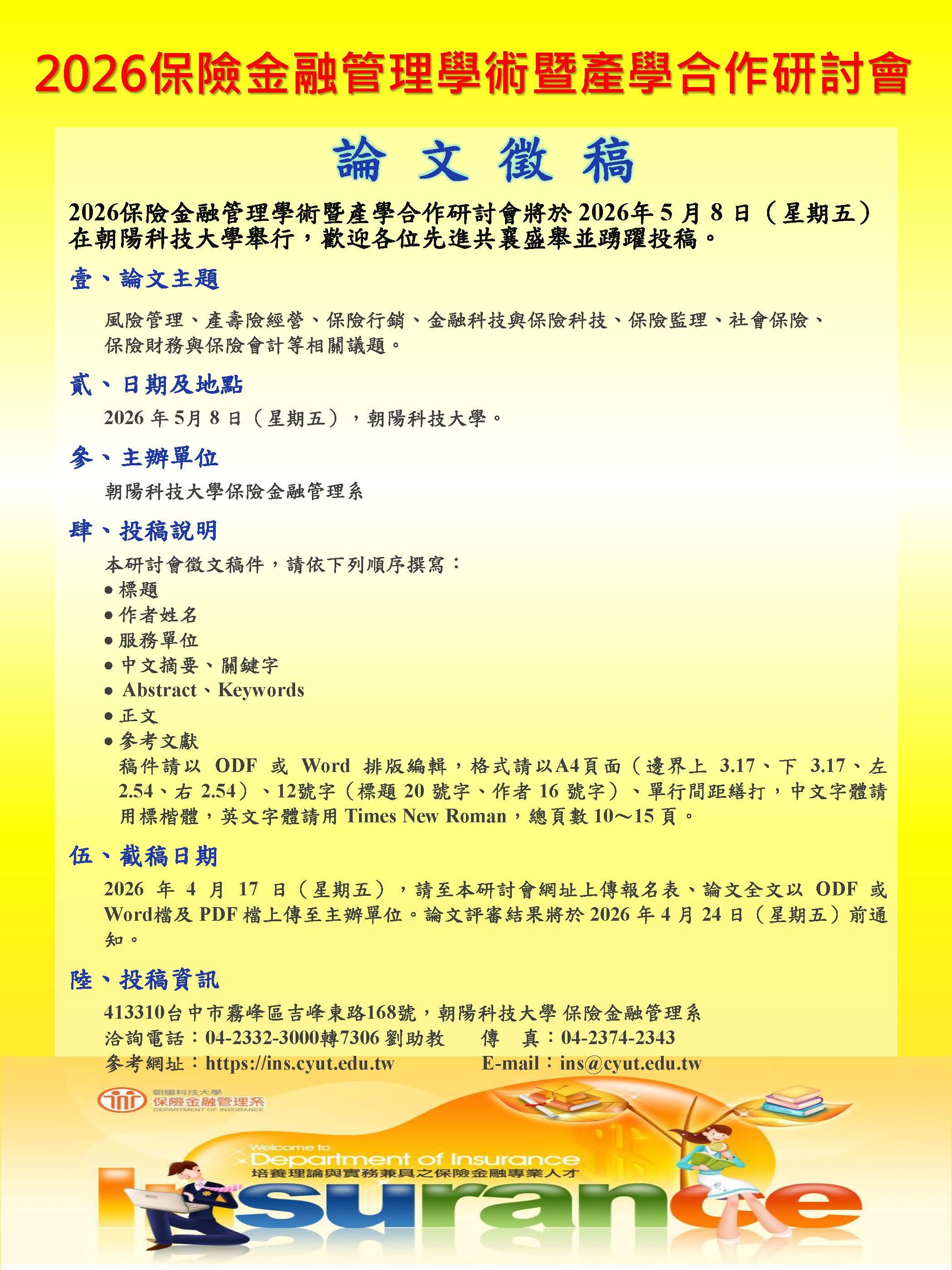 本校訂於 2026年 5 月 8 日(星期五) 舉辦「2026保險金融管理學術暨產學合作研討會」